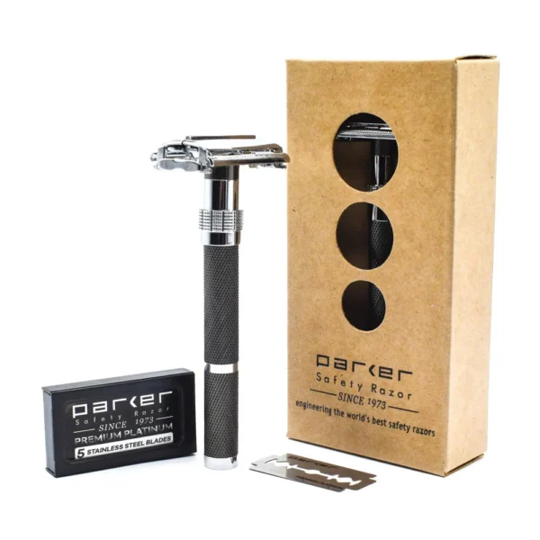 Elevate your grooming routine with the Parker 87R Classic Shave Set. This premium collection includes a classic safety razor, a luxurious badger hair brush, and a stylish stand for a truly exceptional shaving experience.