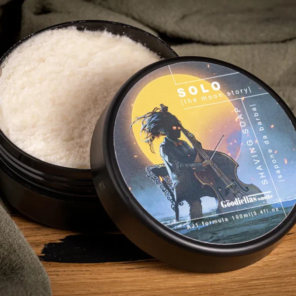 Experience the captivating Solo fragrance with The Goodfellas' Smile shave soap. This Italian-crafted luxury soap delivers a rich, protective lather and a refreshing, invigorating scent.