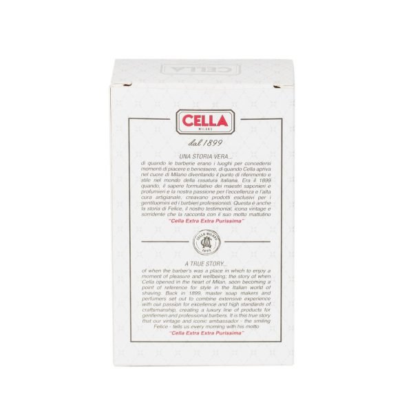 • Extra Extra Purissima: The production process used to make Cella Shaving Cream Soap is an artisanal procedure that still complies with the original manufacturing process dating back to 1899. The inimitable Cream is the embodiment of ultimate quality, thanks to its carefully selected raw materials, the hot mixing phase in a steam boiler, the saponification process, performed with ultra-pure lyes in precise quantities, and the slow maturing phase in a temperature-controlled environment. This is the secret behind an artisanal production process which, for over 100 years, has respected a philosophy of excellence defined by Master Soap Makers as EXTRA EXTRA PURISSIMA.
