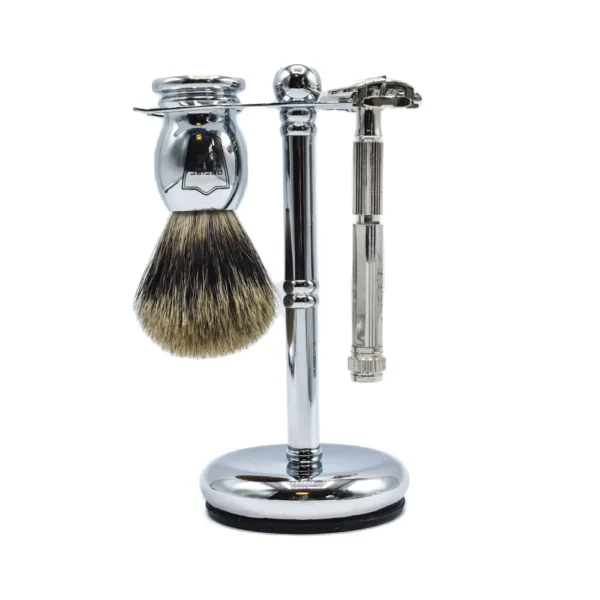Elevate your shaving routine with this sleek chrome stand. Perfectly stores your razor and brush, ensuring optimal drying and longevity.
