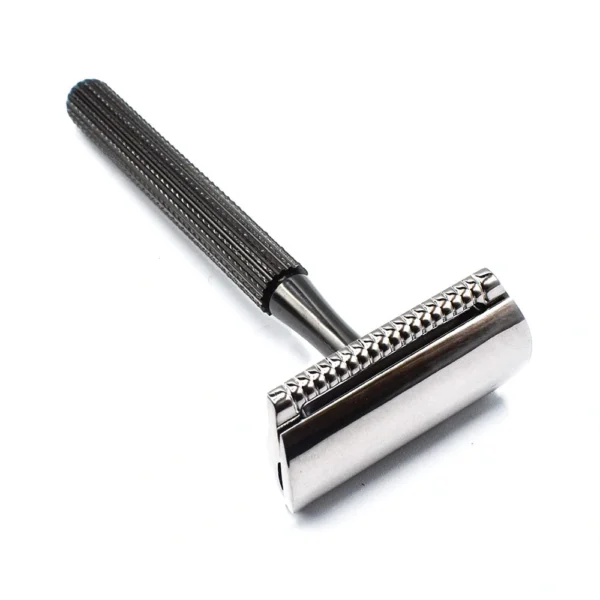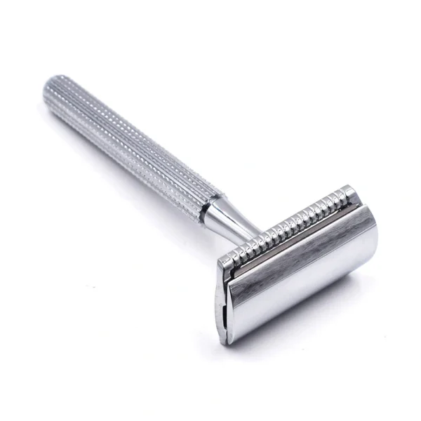 Crafted with a durable, electroplated chrome finish and a solid brass core, the razor offers a perfect balance of weight and grip. The textured handle ensures secure handling, even with wet hands.