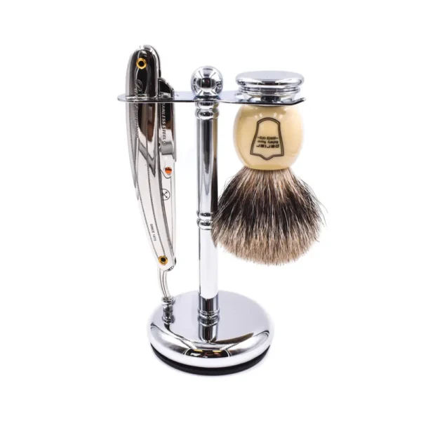 Indulge in the ultimate grooming experience with the Parker Deluxe Chrome Straight Razor & Brush Stand.