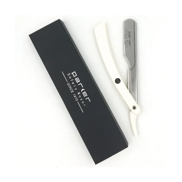 Elevate your shaving routine with the Parker PTW Push Type White Handle Straight Barber Razor. This expertly crafted razor delivers a precise and comfortable shave, often used by professional barbers for their clients.