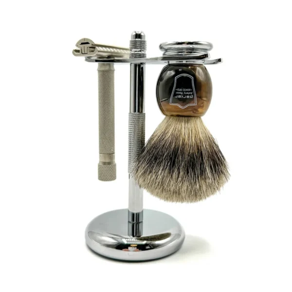 Indulge in the ultimate grooming experience with the Parker Deluxe Chrome Razor & Brush Stand.