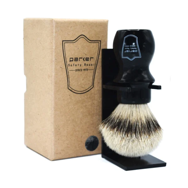 Indulge in a premium shaving experience with Parker’s silvertip badger brush and chrome stand—now in a bold black handle finish.