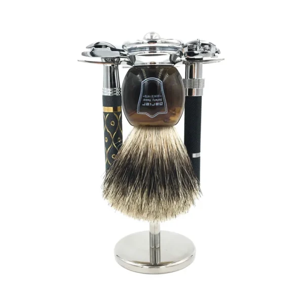 Maximize your bathroom space and protect your shaving tools with our 4-prong stainless steel stand. Designed to hold two safety razors and two shaving brushes of various sizes, it offers a practical and stylish storage solution. Crafted from durable stainless steel, this stand ensures your brushes dry properly, extending their lifespan.