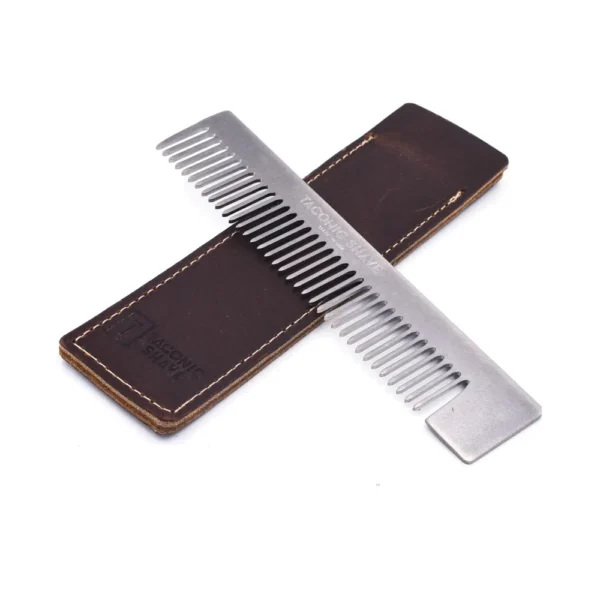 Indulge in the ultimate grooming experience with the Taconic Stainless Steel Pocket Comb and Leather Case.